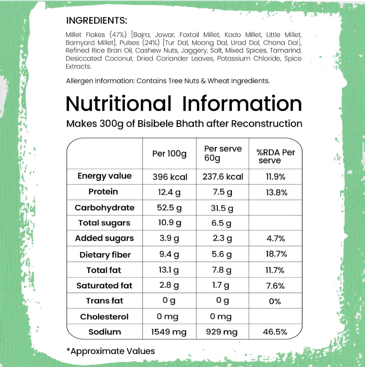 Bring the taste of Karnataka to your kitchen with this Bisibele Bhath, a flavorful mix of spices and wholesome ingredients. It’s a fulfilling dish that’s sure to satisfy your cravings! USP Rich In Protein | Rich In Dietary Fibre | 47% Millets & 24% Pulses | Serves 1 Weight : 10 x 120g Packaging type : Single serve pillow pouch