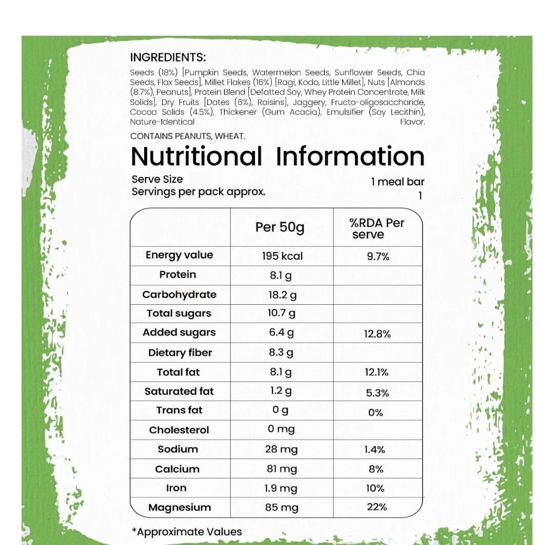Indulge in the rich, satisfying taste of cocoa with our Millet & Cocoa Meal Bar. A delicious and energy-boosting snack that will keep you going throughout the day.