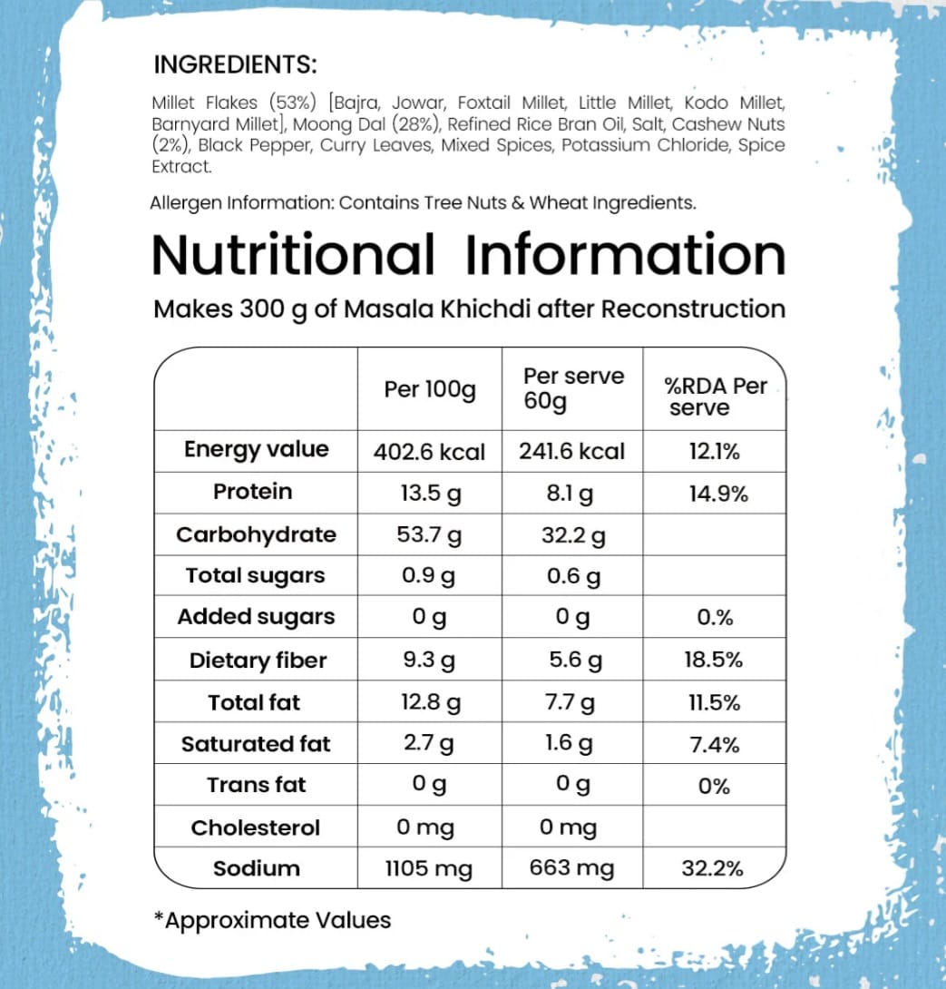 A comforting, spicy bowl of Masala Kichidi made with millets and pulses, inspired by traditional Gujarati and Maharashtrian flavors. Perfect for a quick, wholesome meal when you crave something light yet filling. USP Rich In Protein | Rich In Dietary Fibre | 49% Millets & 26% Pulses | Serves 1 Weight : 10 x 250g Packaging type : Single serve pillow pouch