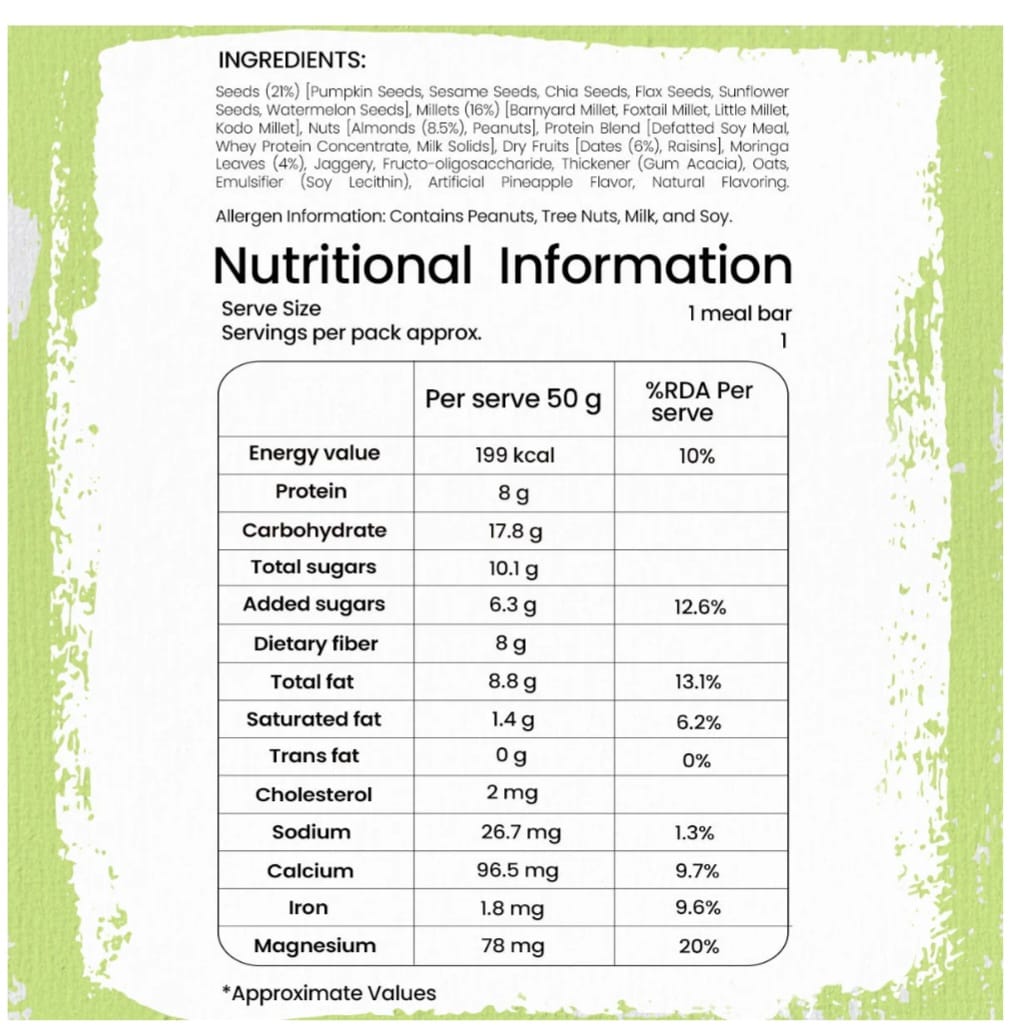 Boost your day with the natural goodness of moringa and millets in our Millet & Moringa Meal Bar. A wholesome and clean snack with the vibrant flavors of organically grown moringa and tropical pineapple.